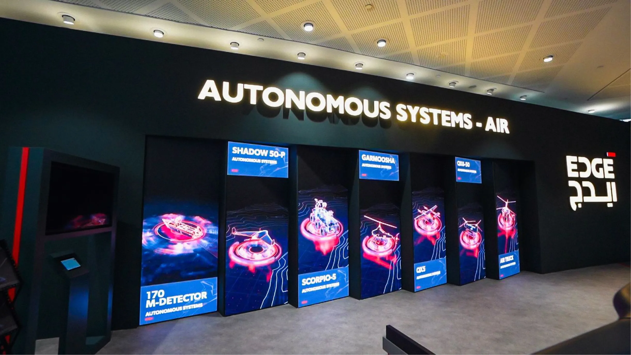 Designed and built the screen experience for EDGE Company's stand at Dubai Airshow, working to strict branding guidelines and technical specifications. The installation featured an interactive product showcase that let visitors and clients explore the full scope of the products on display — turning a traditional exhibition stand into an engaging, memorable experience.